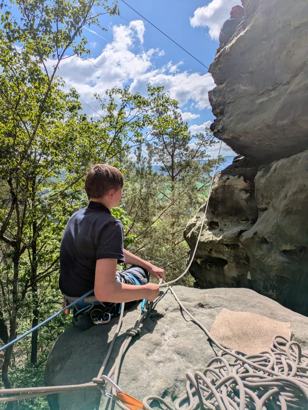 Als große Gemeinschaftsaufgabe wagen wir uns alle zusammen, Kinder und Eltern, über den Alten Weg auf den Papststein. Was für uns erfahrene Kletterer wie ein leichter Zustieg anmutet, ist für manche Eltern hier heute eine echte Herausforderung. Wieder einmal machen wir die Erfahrung, wie gut uns solche Aufgaben mit gemeinsamer Unterstützung gelingen. Die ganze Gruppe auf dem Gipfel! Was für ein Erlebnis. Ganz spontan lernen einige Eltern bei der Gelegenheit das Abseilen und für Dennis ist es sogar schon der zweite sächsische Gipfel. Ob er das am Freitag Abend für möglich gehalten hätte? Gegen 15:00 Uhr stehen alle großen und kleinen KletterInnen wieder unversehrt auf dem Parkplatz zwischen Gorisch und Papststein und treten die Heimreise an.