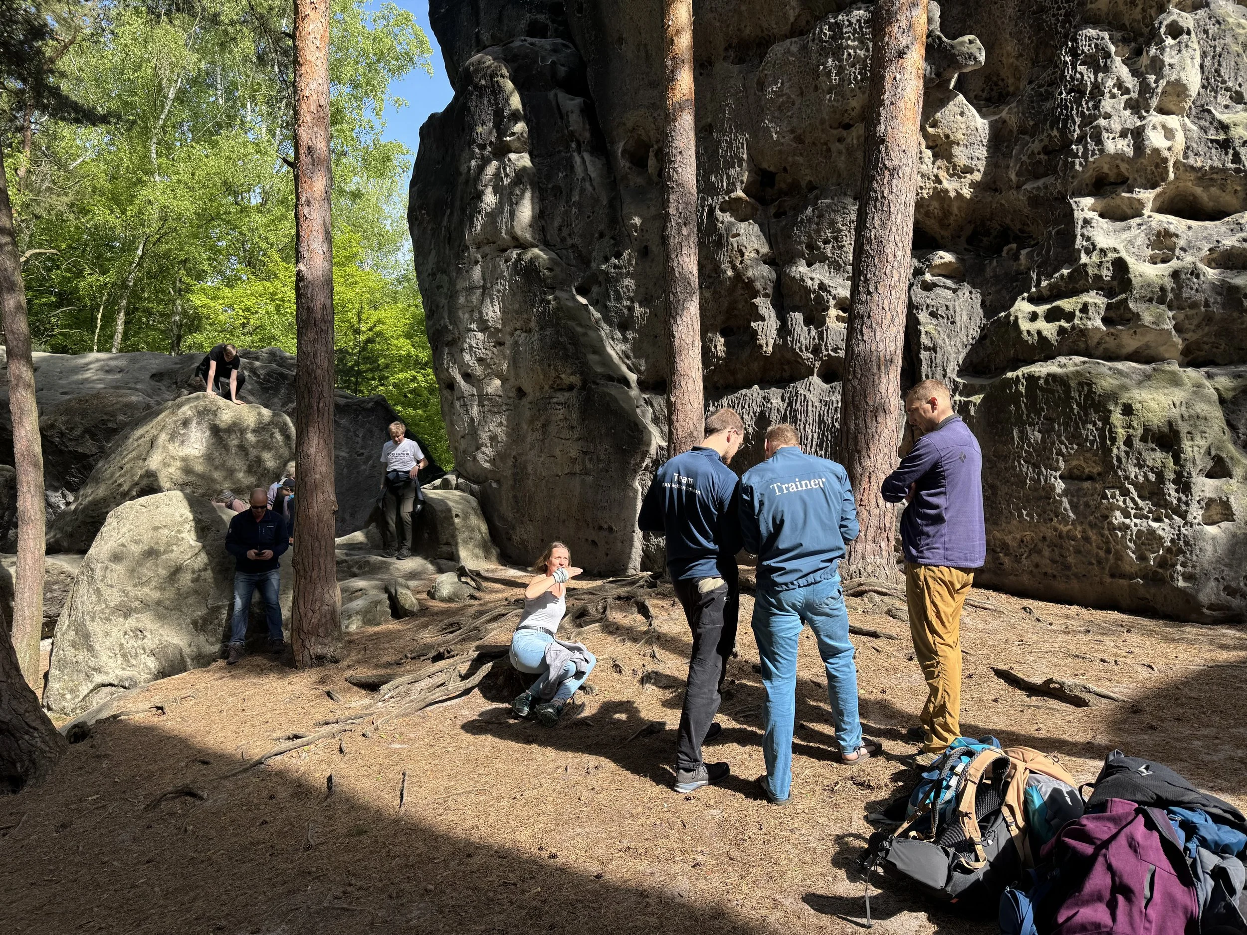 2 Stunden später am Laasenturm treffen wir auf eine weitere Kinderklettergruppe. Sie sind vom SBB. Mit einer freundlichen Kommunikation arrangieren wir uns schnell und beklettern den kleinen Turm von allen Seiten. Für die meisten Kinder ist es tatsächlich der erste Kontakt mit dem sächsischen Sandstein. Das ist natürlich eine Herausforderung. Die in den runden Löchern versteckten Griffe muss man erst einmal finden. Den Füßen gilt es auf der Reibung des Sandsteins zu vertrauen. Und dann auch noch all dieses andere Gedöns von wegen: „Agnes, wo sind hier eigentlich die Haken?“ und „Wie kommen wir hier wieder runter?“ Da ist ganz schnell viel Aufregung und auch ein bisschen Angst vorhanden. Selbst die Erwachsenen ringen mit sich. Dennis, der so unglaublich gern für uns alle kocht, vor Höhe aber einen heiden Respekt hat, wächst hier heute über sich hinaus. Zwei Mal nimmt er vergeblich Anlauf an der Südostwand. Über die Ostkante gelingt ihm dann sein erster sächsischer Gipfel. Auch die Kinder, von groß bis klein, entwickeln mit jedem Weg mehr Vertrauen in den Stein, die Kletterei, das Material und die Abläufe auf dem Gipfel. Ich blicke in fröhliche Gesichter.