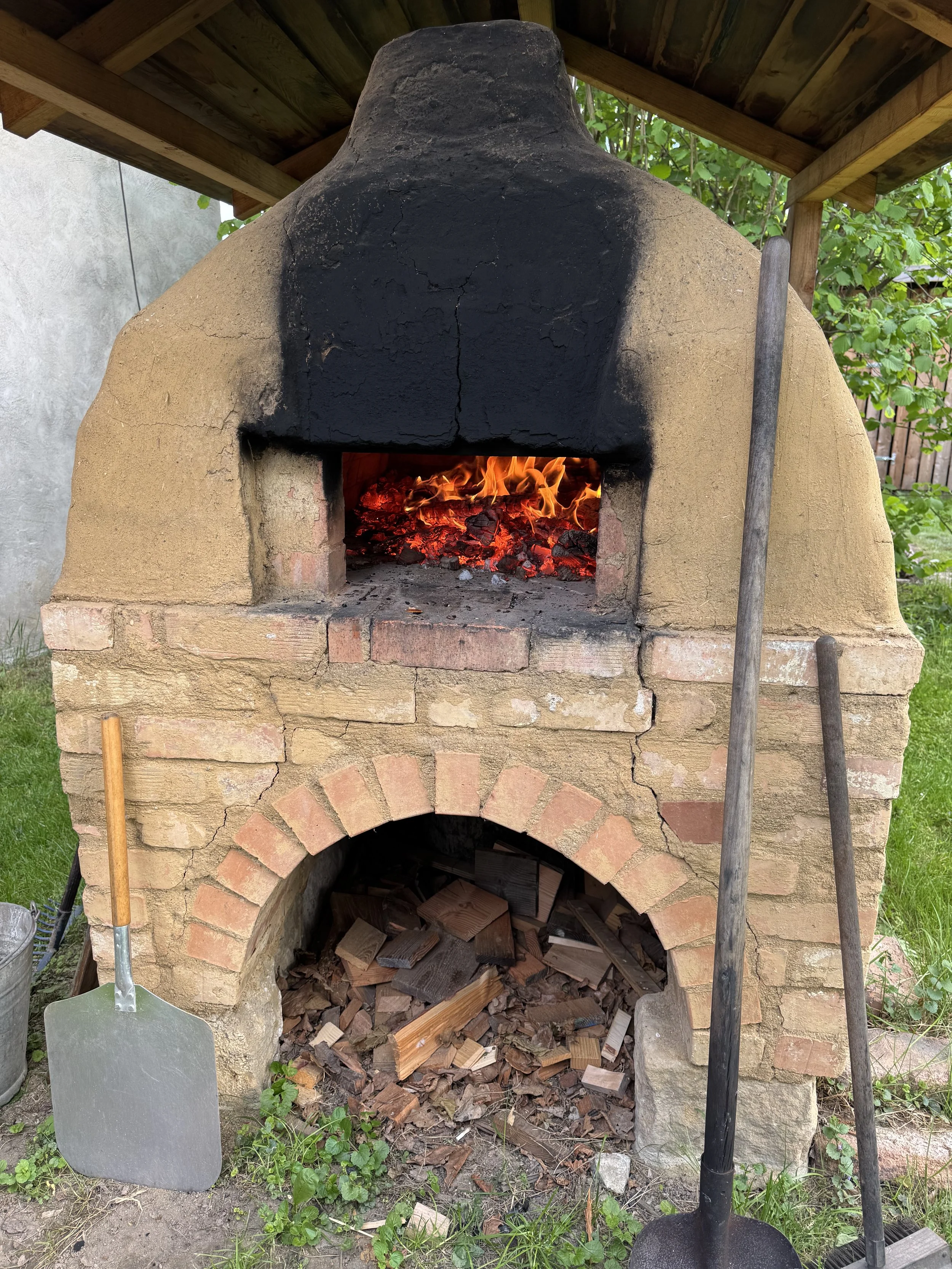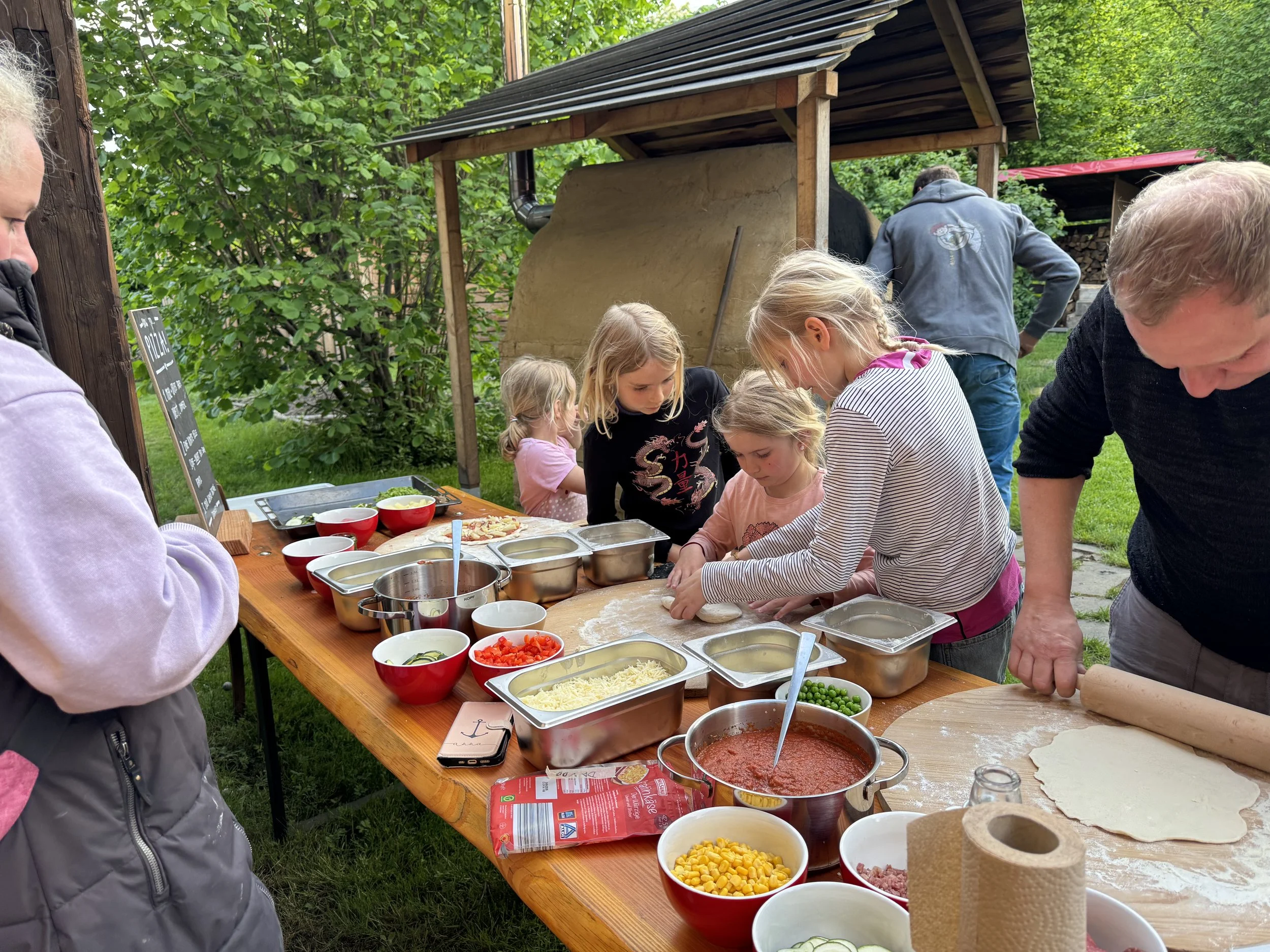 Auf dem Heimweg werden die Energiereserven mit einem Eis wieder aufgefüllt und im Hostel Hinterland hat Christoph den großen Pizzaofen bereits angeheizt. Aus den vorbereiteten Teiglingen werden hier mittels „busfahrerkreiselnden“ Bewegungen Pizzaböden geformt und ganz individuell belegt. Falk und Valentin wechseln sich im Bestücken des Pizzaofens ab. Das klappt tatsächlich erstaunlich gut. In dem ca. 230 Grad warmen Ofen brauchen die Pizzen nur 2 bis 3 min und sind verzehrfertig. Nur die Calzone liegt dann wohl doch etwas nah an der Glut. Die fängt ganz unvermittelt ein bisschen Feuer.